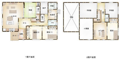 ご夫婦が1階フロアーだけで生活できるように設計。丸太梁が大空間のアクセントに良く効いています。2世帯にも備えた間取りで。
