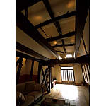 入口と庭から差す光が天井の梁にまで届き、美しい陰影をつくりだしています。