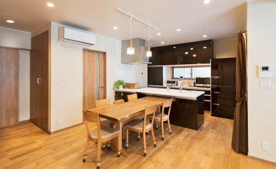 かねてからお使いの無垢材の家具に合わせ、室内は自然のぬくもりを感じるあたたかみのある空間に。ウッドデッキ敷の中庭を中心にしてLDKの採光を確保。ご両親想いのS様のご希望でしつらえた仏間と一体化した、広々LDKになりました。