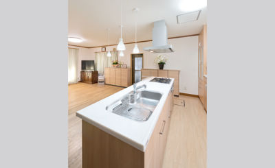 もともと十分に広いLDKでしたが「物が増えてしまって収納が追いつかない」とお悩みだったT様。そこで、壁付けだったキッチンをアイランドキッチンに変更し、収納もたっぷり確保しました。カウンターの周囲をぐるりと回れる“行き止まりのない”空間にすることで動線がスムーズになり「ずいぶん楽になりました」と奥様。娘さんやお孫さん達といっしょにお料理を楽しめるようになるなど、新しいキッチンライフを満喫しています。