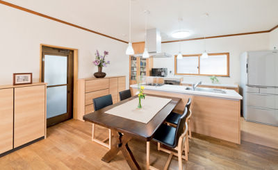 もともと十分に広いLDKでしたが「物が増えてしまって収納が追いつかない」とお悩みだったT様。そこで、壁付けだったキッチンをアイランドキッチンに変更し、収納もたっぷり確保しました。カウンターの周囲をぐるりと回れる“行き止まりのない”空間にすることで動線がスムーズになり「ずいぶん楽になりました」と奥様。娘さんやお孫さん達といっしょにお料理を楽しめるようになるなど、新しいキッチンライフを満喫しています。
