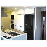 収納はパナソニックのキュビオスです。レンジや冷蔵庫が計算どおりに、スッキリと収まりました。扉は光沢のある鏡面のホワイトです。お手入れしやすく、汚れは水拭きでOKです。