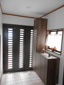 玄関収納にトール収納を設けることで、収納力がアップし、すっきりと納まり片づいた。