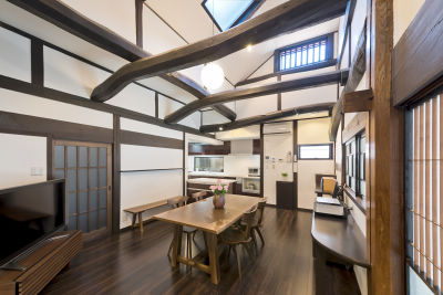 伝統ある古民家を「古民家カフェのようにしたい」とのご要望だったS様。天井をなくし丸太梁の味わいを活かしたLDKはキッチンと一体感のある大空間に変身。足元も床暖房で暖かく、古民家特有の寒さも和らぎます。明るさと使い勝手が増したキッチンも「家族とコミュニケーションできてお料理が楽しい」と奥様お気に入りの場所。冷たい印象だった土間の玄関は、式台を2段にすることで段差を解消。お客様が長居できるコミュニティスペースに生まれ変わりました。