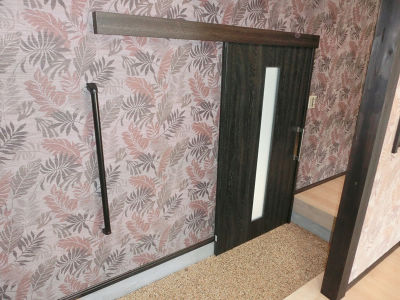 既存の入口は片開きドアだったが、引き戸にし開閉時もすっきりとさせた。式台への上がり端には手摺りも設けた。