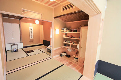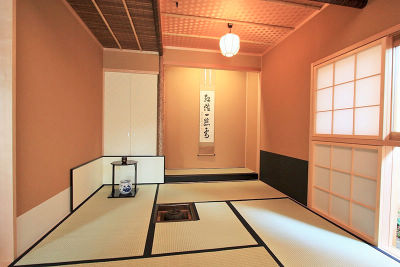 露地を通って、躙口(にじりぐち)から茶室に入る本格的な4畳半のお茶室。壁には剥落防止の為に紙をはりました。(腰貼)