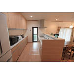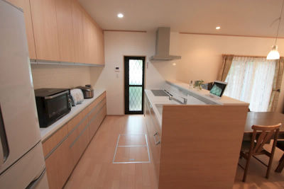 リビングステーションNEW Lクラス・スマートステップ対面ディスプレイタイプを採用。カップボードは間口2700mm、たっぷりの収納量。対面にテーブルを配置し、優雅な空間となり、家族の会話が弾み、お気に入りの居場所です。