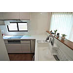形は奥様お気に入りのL型を採用。対面にインテリアカウンター。小物装飾を置かれ楽しんでおられます。照明はダウンライト美ルックを採用。より美しく見えます。