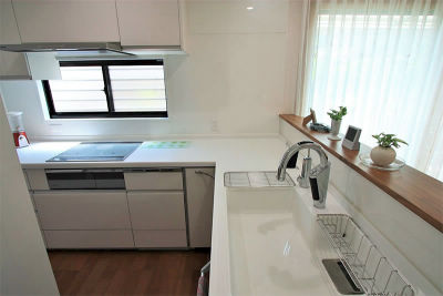 形は奥様お気に入りのL型を採用。対面にインテリアカウンター。小物装飾を置かれ楽しんでおられます。照明はダウンライト美ルックを採用。より美しく見えます。