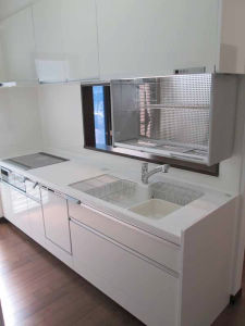 たっぷりの収納ができるリフォムスキッチンに色はビューティーホワイトを選び明るい空間ができた。また、火を使わないIHクッキングヒーターにした事での安心と、食器洗い乾燥機や電動昇降水切り棚を設置し、楽に使いやすいようにした。