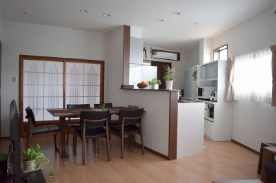 既存のDKと和室の居間、廊下を広いLDKに改装。既存の間仕切りがなくなったため、東からの光が部屋の奥まで入り、風通しの良いLDKができました。