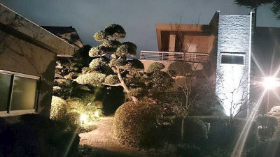 広い庭に沢山の木々が生い茂り、夜は真っ暗になる為、不安なく歩ける為の灯りプランをご提案させて頂いた。足元の不安をなくす為にアプローチにはエントランスライトで暗い足元を明るくすると共に、建物にはスポットライトをあて、幻想的な雰囲気に仕上げた。クリスマスシーズンに向け、幾つかの木をライトアップさせる為の電源確保工事も併せて施工した。