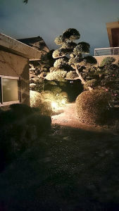 門から玄関へと続くアプローチにエントランスライトを2灯設置。建物正面には、LEDスポットライトをあて、池の端の木を2本イルミネーションで飾る為の電源も確保。省エネの為に、全てに定刻消灯タイマー付EEスイッチを接続した。