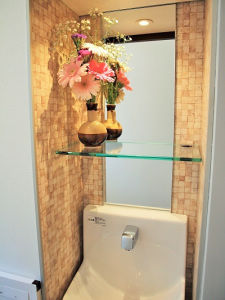 サイドの壁は水はね対策としてタイル柄のパナソニックキッチンボードを貼り可愛らしくしました。ガラスの飾り棚でインテリアも楽しめます。