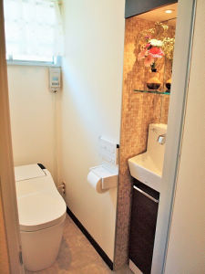 サイドの壁は水はね対策としてタイル柄のパナソニックキッチンボードを貼り可愛らしくしました。ガラスの飾り棚でインテリアも楽しめます。