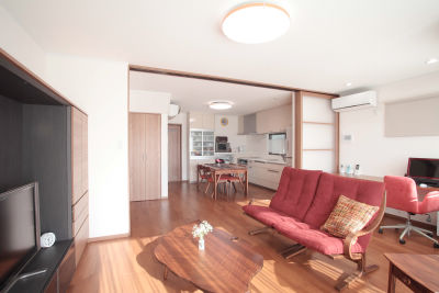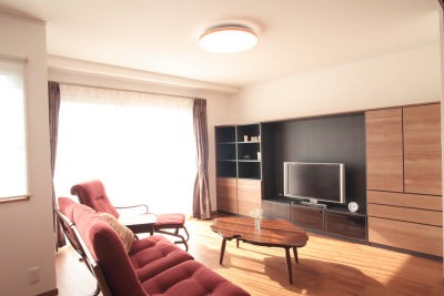 お嬢様の車椅子生活に対応すべく「1階は全面的に車椅子での移動がスムーズにできるように」とご希望のK様。車椅子での移動に妨げとなる凹凸があった収納は壁面いっぱいをフラットに使うキュビオスを採用。またリビングの動線の妨げにならないよう、壁面に多目的に使えるカウンターを造作しました。ダイニングとの間には3枚片引き戸を採用し、より広い空間になるよう工夫。部屋がすっきりと整理され、玄関からリビングまでスムーズに移動できるようになりました。