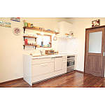 活用されていなかった離れを住居としてリフォームされたN様。離れの水廻りはシンクしかなく、居住性を充分に備えていなかったため、キッチン、シャワールーム、洗面室やトイレを新設し、住まいとしての機能を集約しました。モザイクタイルや落ち着きのあるウォールナット柄のフローリングがレトロシックな雰囲気を与えます。隣接の和室は、DKとのつながりを感じる憩いの空間。既存の造りをほどよく活かした「和リビング」のような趣となりました。