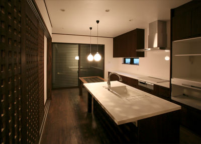 ダイニングと一体化したオープンキッチンで広々と。食事の時間や、その前後に、ご家族が全員で団欒できるくつろぎのスペースを確保。