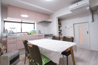 白を基調とした中にピンクのキッチンがとても素敵です。明るい空間となりました。