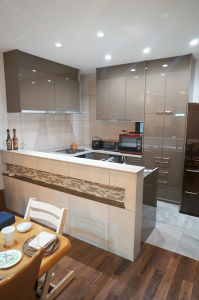 収納の扉を鏡面仕上げにした事で高級感のあるキッチンへと変身しました。