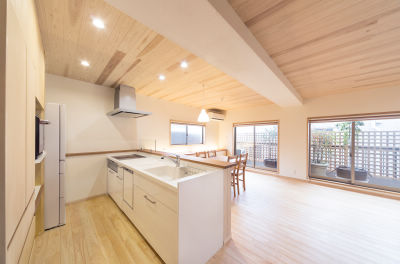 賃貸住宅として貸していたご実家隣の建物をリフォームしたH様。「木を使った家に住みたい」とのご希望通り、木の香りに癒される室内は、奥様の故郷から調達したヒノキの床と杉の天井など木質感たっぷり。リビングを中心に行き止まりの無い回遊性を持つ室内はのびのびとした広がりがあります。素足で出られるアウトドアリビングのようなウッドデッキには植栽をふんだんに設けました。