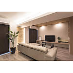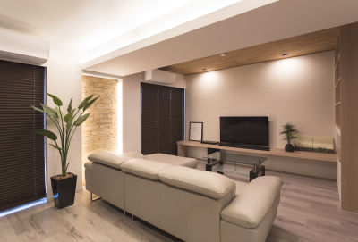 点検口などマンションならではの問題を間接照明で解決するアイデアが見事。高級感と温かみのある落ち着いた空間になっています。