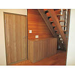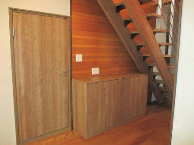 階段下にも玄関収納を設置。車庫から入るドアの横にあるので、すぐに靴がしまえます。っもちろん、こちらもチェリーで色合わせ。