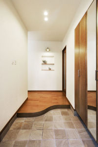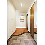 玄関を入ると、可愛らしい照明とニッチ棚がお出迎え。折れ曲がっていた廊下を最小限の直線に修正し、動線もスムーズに。