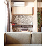 リビングの一角につくったパソコン兼勉強スペース。スリット格子で仕切り、集中できるコーナーに。