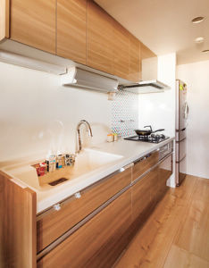 キッチンは開口部を広く取って冷蔵庫の位置を変更し、ダイニングとつながるように。面材も、ダイニングのインテリアと好相性の木目柄に。