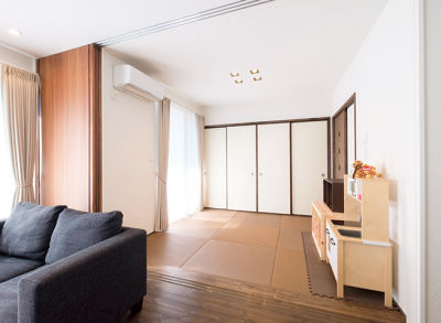 和室の引戸を開放すると、LDKと一体となった開放的な空間に。子どもたちものびのび動き回れます。