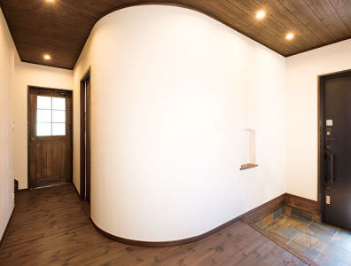 玄関を入ると、アールの漆喰塗りが印象的な壁が目に入ります。壁の内側は、クローゼット。