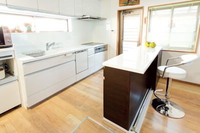 独立した息子さんがお孫さんを連れて遊びに来るようになり、キッチンや食卓が手狭に感じていたY様。木目調の内装で暗い印象なのも気になっていました。そこで、キッチンを奥まった西側から明るい東側に移動し、開放的なI型キッチンに変更。ダイニングとリビングの間の壁は取り払い、開放的なLDKが実現しました。「居心地がよくなり、息子たちが来る回数も増えました」と喜ばれています。