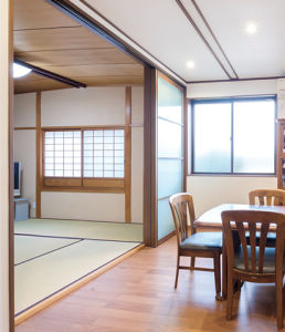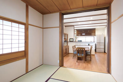 親戚が集まる機会の多いN様は、もてなすための広く使える空間を要望。既存の和室をいかして、ダイニングとの間に間仕切開閉壁を設置し、開けば広いLDKとしても使えるように変更しました。「親戚などが集まった際には、キッチンにいても話が弾むようになりました。対面キッチンなので配膳もしやすく、とても便利です」とN様も大満足。ダイニング側に付けたニッチ棚もポイントとなり、飾り棚として活躍しています。