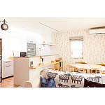 ご家族がほとんどの時間をリビングで一緒に過ごすというT様邸では、2匹のワンちゃんもその一員。リフォームをする際も、愛犬たちが滑らないよう床は凹凸のあるものを選び、リビングの一角にはタイル張りのひんやりエリアを設けました。お子さんがリビングでも勉強できるように、キッチンの対面壁前にはカウンターを設置。使われていなかった洋室を広げ、リビングをより快適な空間へとつくり替えました。