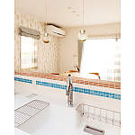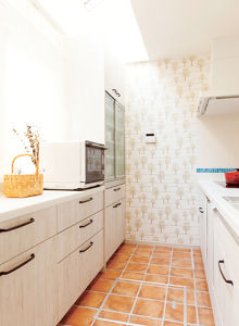 カウンターの立ち上がりが目隠しになり、空間をすっきりと演出。青と白のタイルは奥様のセンス。清潔な印象に。