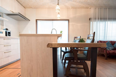 庭の手入れやハンドメイド、絵は個展を開くほど、という多趣味な奥様は1日のほとんどをこの場所で過ごしています。そんな居心地のよさは、既存をいかしたリフォームならではのあたたかさにあります。吊り元を変えて内開きから外開きにしたドア、「いじらなくて本当に正解だった」というクラシカルな天井などお気に入りの内装は残し、ウッドブラインドなどの新設部分に落ち着いた色を選んで融合。「木に合うようなライトがいいな」と2人で選ばれたアンティーク照明のアクセントが、A様お好みのレトロなカフェ風を演出しています。