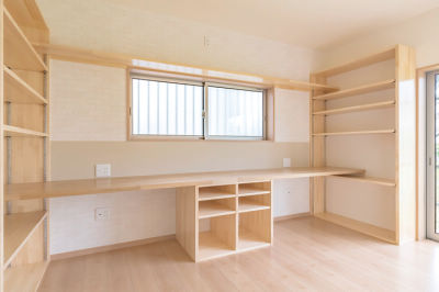 小学生のお子さん2人のための学習スペース。本棚とタモ集成材のカウンターは大工さんの手づくりで、木の味わいも魅力。