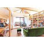 2階は減築し、その分、大小5つのテラスが生まれました。それぞれのテラスに植栽が置かれ、「家の中のどこにいても緑を感じられるのが嬉しい」とご夫婦ともに大満足。「リビングにつながるテラスから眺める山々の稜線と、そこに沈む夕日を見ていると、心が豊かになります」と、借景をいかした間取りが暮らしにゆとりを生み出しているといいます。屋根を架け替えたことでキッチンとリビングを勾配天井にし、開放的で気持ちのよい空間に。天窓から明るい日差しが降り注ぎ、ブックカフェのようなコーナーが設けられ、夫婦のくつろぎタイムを贅沢に演出しています。
