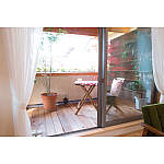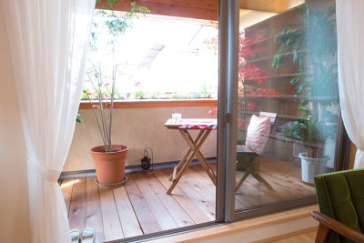 “ゆうひテラス”は屋根付きなので雨が降っても大丈夫。ここにもトネリコの鉢が。