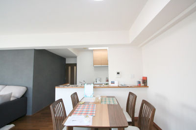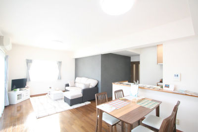 元々隣接和室だったが引戸部分を壁にして空間のアクセントに 家具のレイアウトもすっきり納まり使いやすくなりました キッチンもオープンにし開放的に 部屋に変化をつけることによってオシャレに