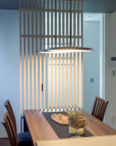 玄関からの視線をゆるやかに遮る縦格子の仕切りでプライベートを確保。デザイン性も高くお洒落な雰囲気を演出。
