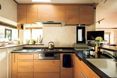 L型キッチンは使い勝手抜群。「汚れが落ちやすく、手入れが簡単になりました」と奥様。