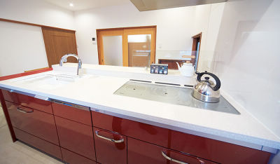 近所に住む娘夫婦や孫、両親が集まって食事ができる場にしたかったので、カウンターテーブル付きのキッチンにして正解でした。料理をしながら家族とおしゃべりできて嬉しいです。ショウルームで一目惚れしたルージュレッドのキッチンは使いやすくて高級感もあり、気に入ってます。