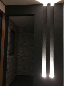 エントランスには壁にナロービームライトを設置。黒い壁紙にしたことでより一層映える空間になった。