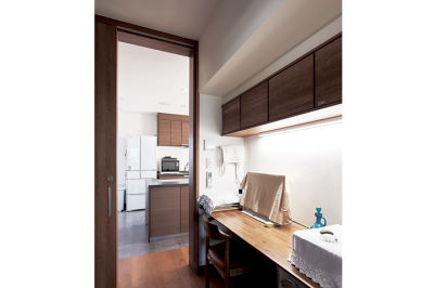 キッチンは娘さんと一緒でも使いやすいアイランド型に。ガスコンロを壁側に配置したことで、レンジフードも壁付けでき、キッチンの上がすっきり。隣に家事室を設けて、奥様の作業スペースをまとめました。大きなモノの収納場所としても活躍しています。