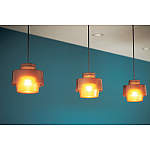 ペンダントを流し元灯に。ブルーの壁紙と相まって美しく映えます。