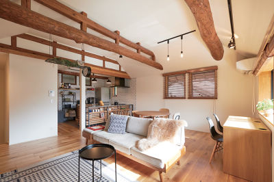 LDKは採光や風通しを考え2階に配置。立派な梁があったため、これを活かして天井を高くし開放感を演出しました。インテリアスタイルを決める床材と同系色の塗料を梁や窓枠に施し、空間に統一感をもたらしました。