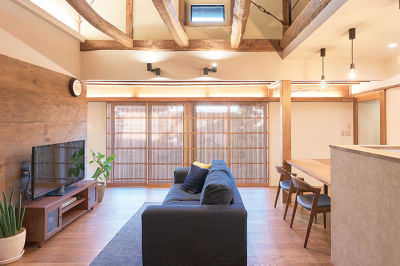 テーマ 団らんキッチン、古民家再生、自然素材、吹き抜け、耐震
