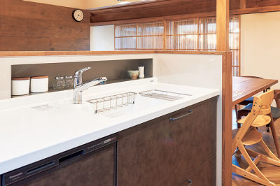 家族と会話を楽しみながら料理ができる対面キッチン。手元を隠す壁は、小柄な奥様に合わせて高さを決めました。